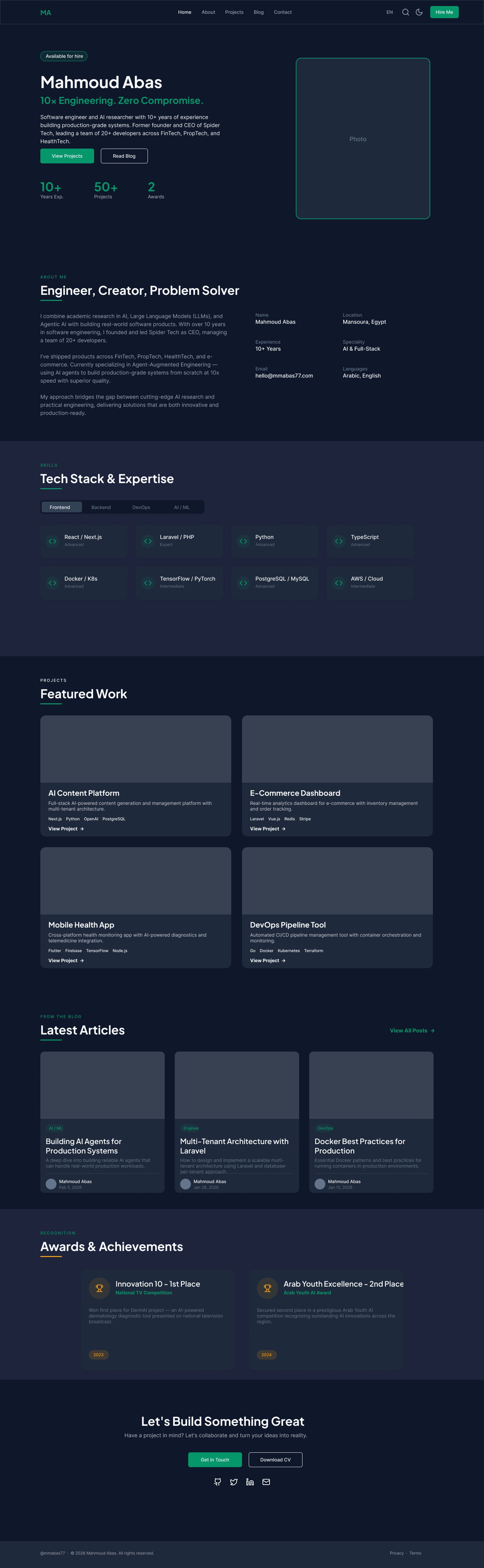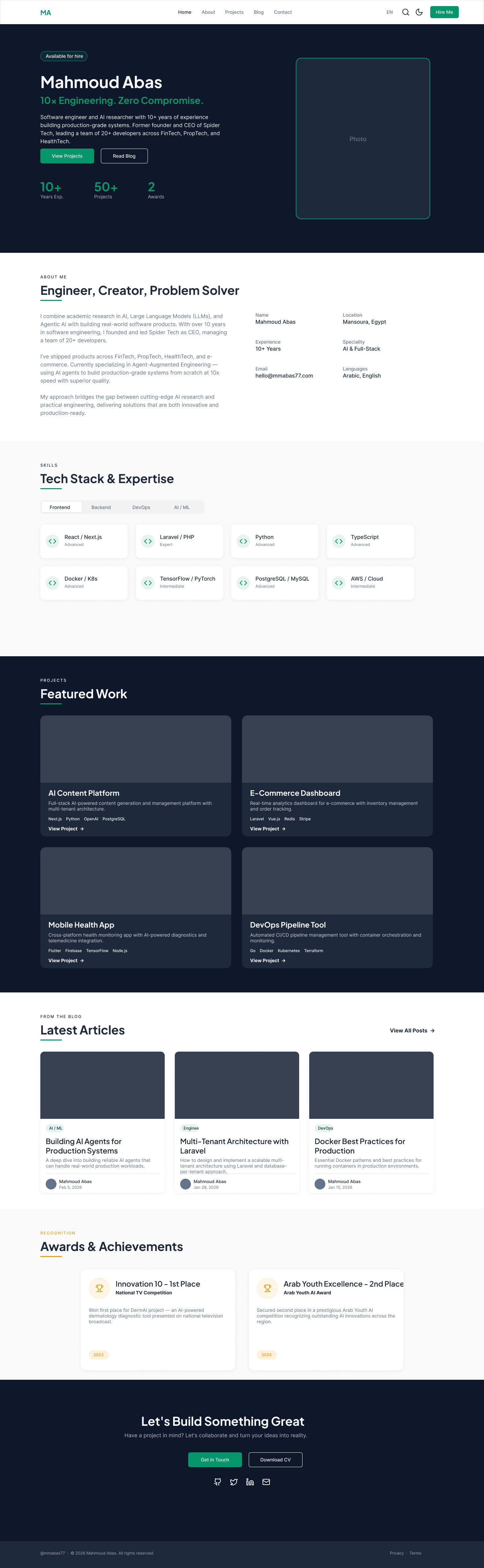 كمهندس برمجيات وباحث في الذكاء الاصطناعي بخبرة تتجاوز 10 سنوات، كنت أحتاج إلى مساحة على الإنترنت تعكس حجم ما بنيته وما أفكر فيه — لا مجرد صفحة CV جامدة. كنت أريد موقعًا يحكي قصتي: مؤسس Spider Tech، باحث في LLMs، مدرّس جامعي، ومهندس يبني أنظمة إنتاجية حقيقية.
