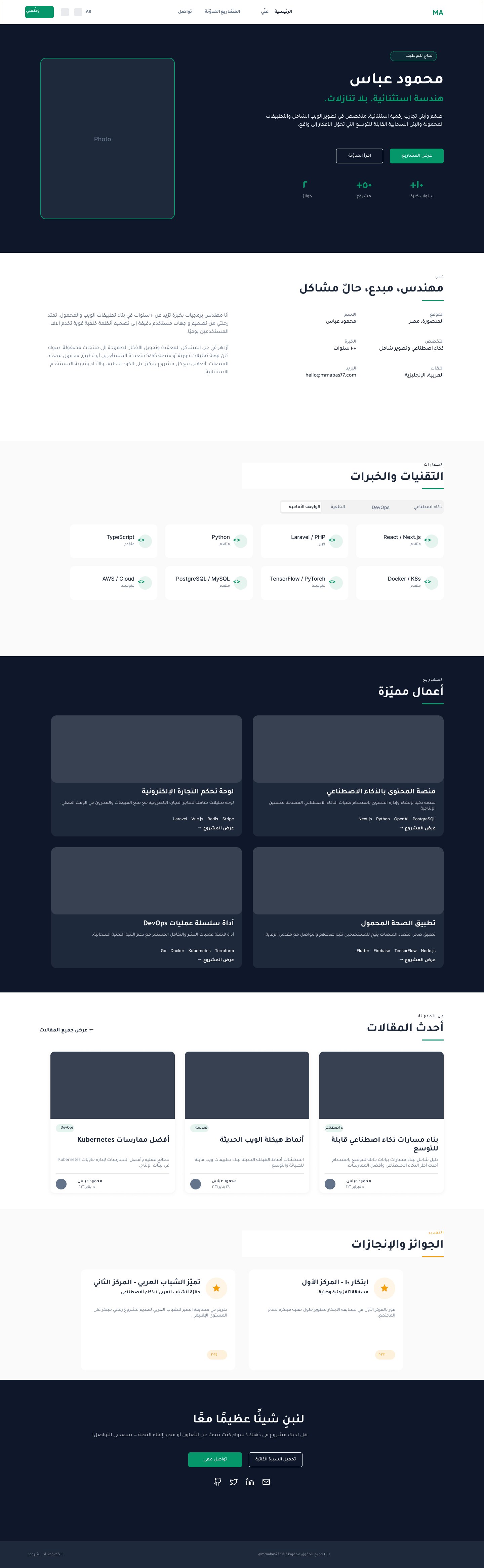 - صفحة الرئيسية (Portfolio): Hero section بإحصائيات حقيقية (10+ سنوات، 50+ مشروع، جائزتان)، قسم عن تخصصاتي في الذكاء الاصطناعي والـ Full-Stack.